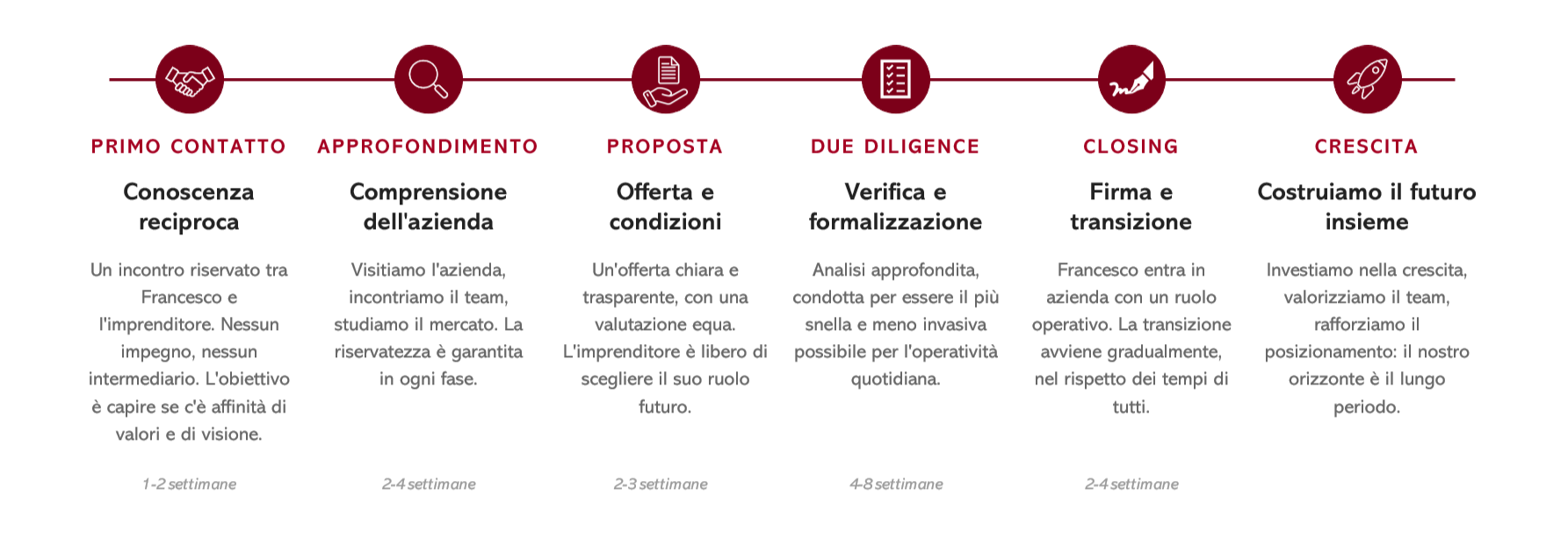 Dall’incontro alla firma: 3-5 mesi. Grazie a una struttura decisionale snella, possiamo muoverci rapidamente e adattarci ai tempi dell’imprenditore.
